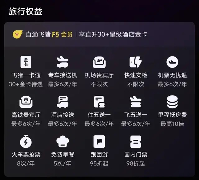 ▲黑钻会员直通飞猪F5会员后权益相当亮眼