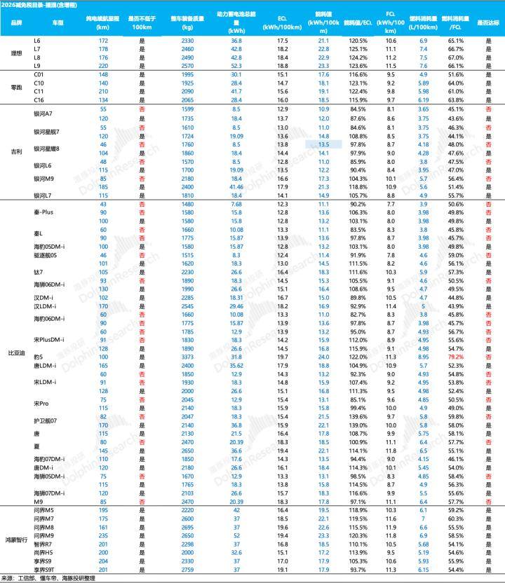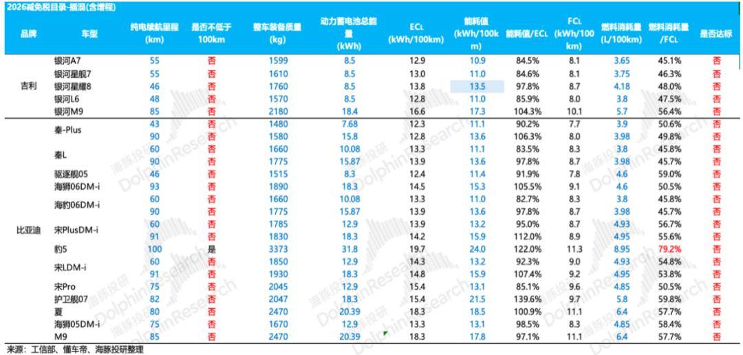 为整理出能够进入2026年及以后生效的《减免税目录》的车型名单。海豚君对已覆盖车企的在售PHEV车型(共40余款)进行达标测算,发现从单个车企维度的影响: