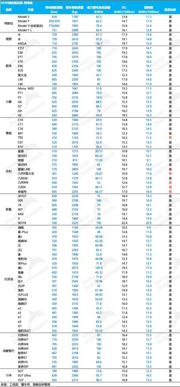 为了更直观地评估新政策的实际影响,海豚君对已覆盖的多家新能源车企在产在售的纯电车型(若存在新旧款同时销售的情况,选取新款车型)进行了逐一测算,并整理出能够进入2026年及以后生效的《减免税目录》的车型名单。