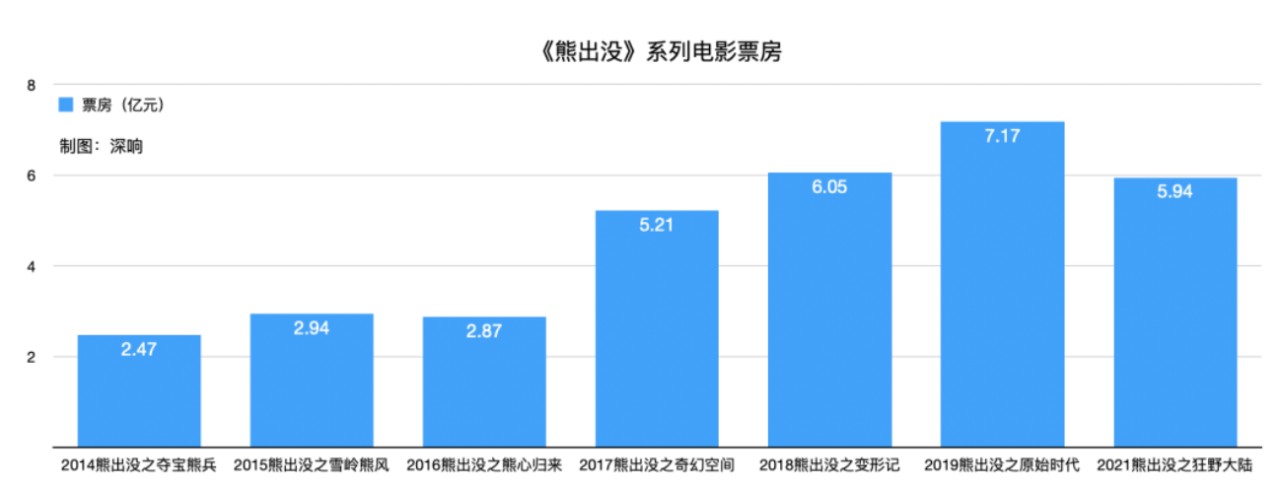 相比于日渐式微的喜羊羊,熊出没则正在“壮年期”。2014年,熊出没的第一部电影《熊出没之夺宝熊兵》在《喜羊羊》、《神偷奶爸》等动画片的夹击之下三天过亿,之后票房也非常稳定,近几年的票房水平更是都在5亿以上。