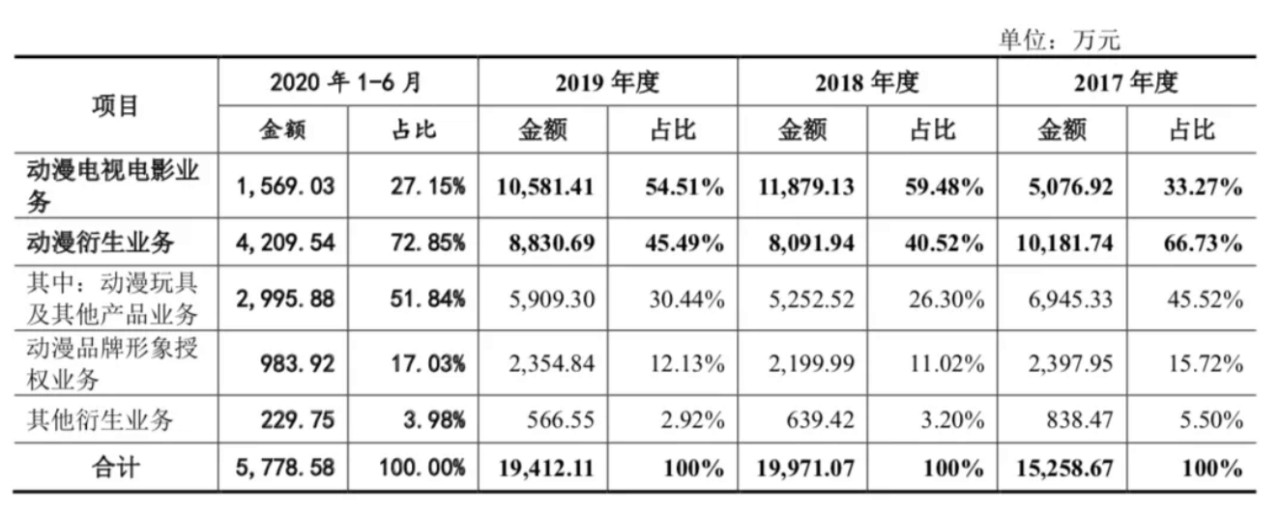 除了可以看的内容,猪猪侠的真正潜力则是在衍生品上。2019年,咏声动漫分别实现营业收入1.94亿,其中动漫电视电影业务带来的收入和动漫衍生业务带来的收入几乎持平。到了2020年上半年,其衍生业务的收入占总收入的比例达到了72.85%。