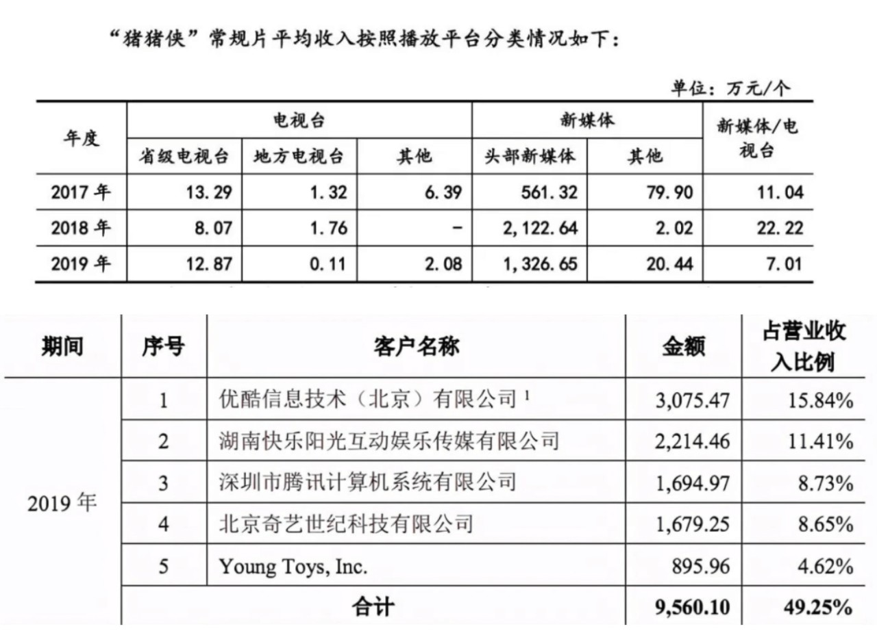而发行收入方面,猪猪侠则依赖于视频网站。来自于优爱腾芒的收入占营业收入比例近50%。并且相比于影视剧、综艺,儿童动画的价格可以说是“极低”。2018年视频平台曾大幅提高采购价格,但经过高峰后2019年价格整体都有所回落。