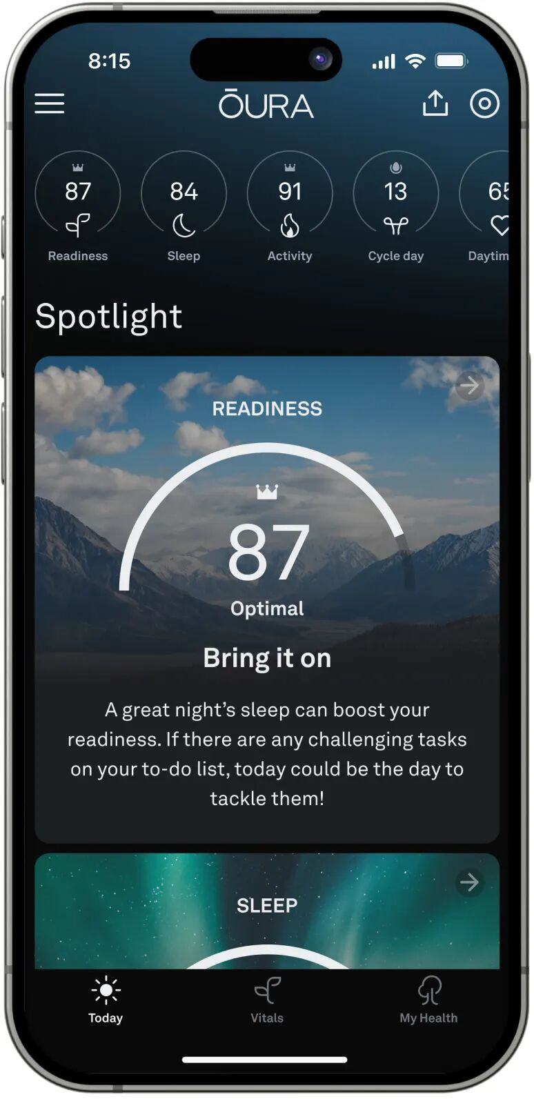 在软件层面,Oura Ring 4搭配的App相比之前进行了重构,显示用户的今日状态,生命体征和健康。它能显示Oura Ring 4检测的用户7个领域的健康状态。