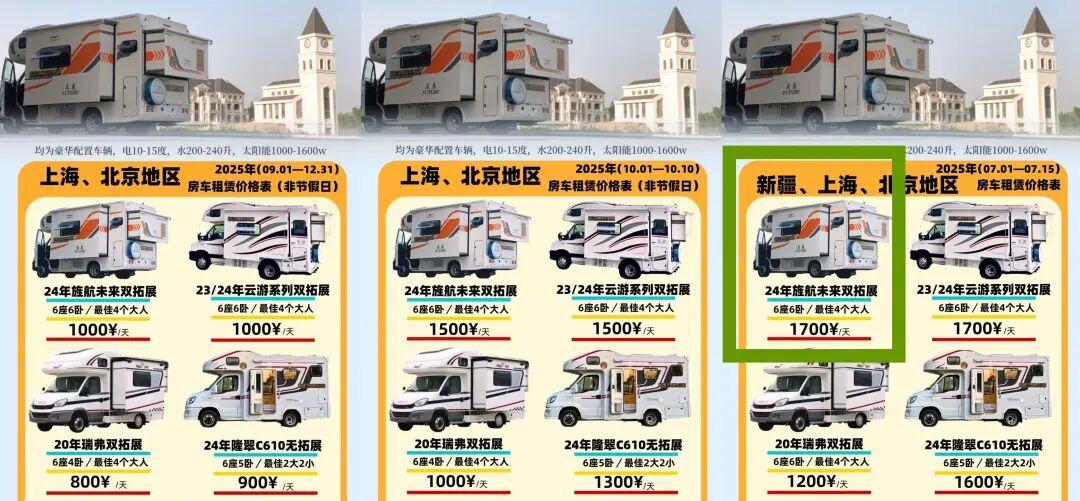 「电商在线」发现,在国庆期间,不少房车租赁公司给出的报价均在千元/天之上,以24年旌航未来双拓展车型为例,在10月初的租赁报价为1500元/天,日常价格则在1000元/天,在暑假旺季时报价甚至一度攀升至1700元/天。