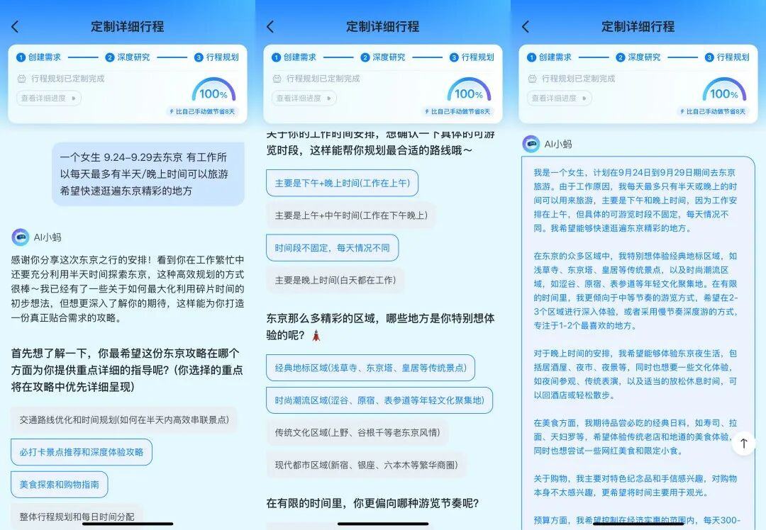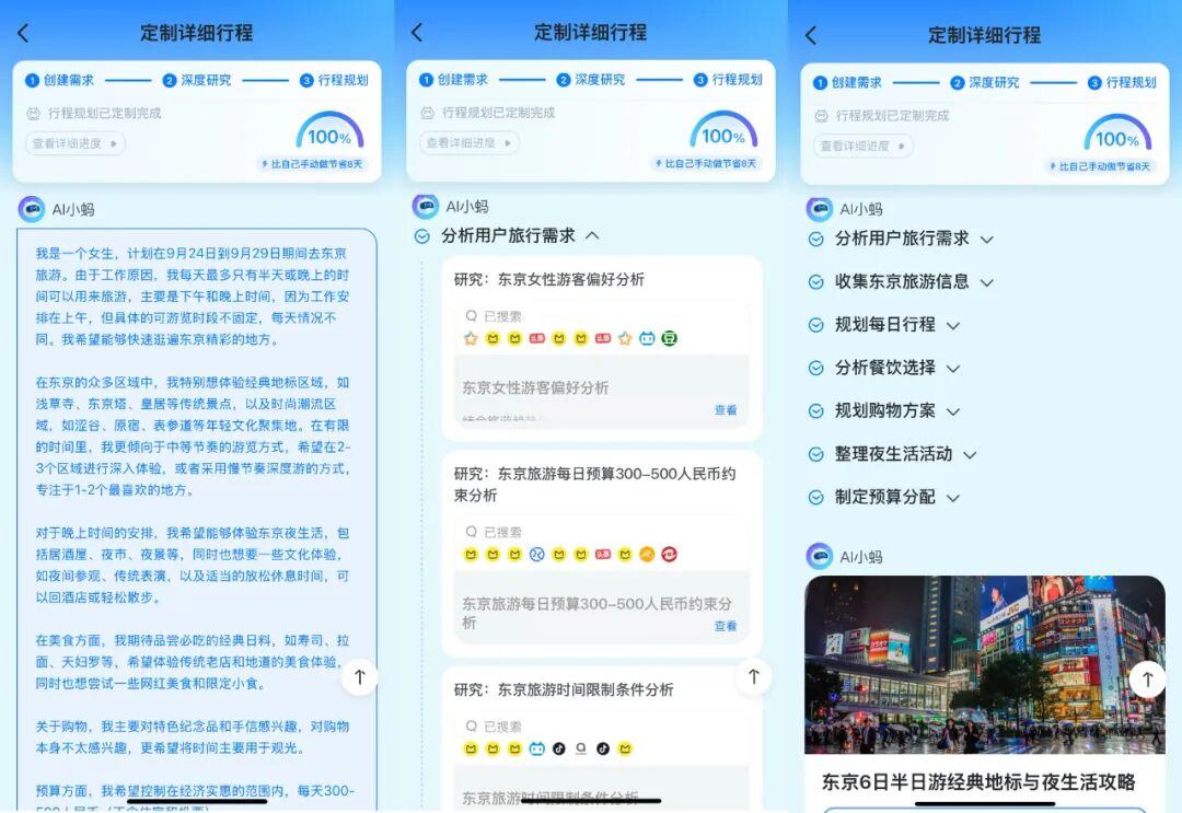 可以看到,它把我的行程拆成了每日规划、餐饮选择、预算分配等多个类目,挨个进行了搜索和分析。完全没有做攻略的笔者,看着它在后台忙碌地「查攻略」,心里确实多了几分安心。