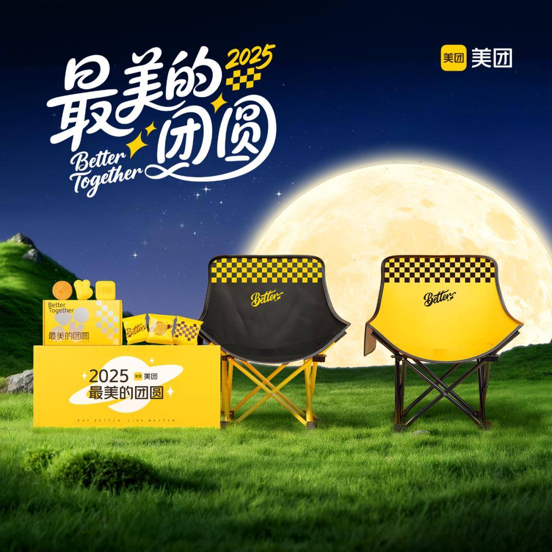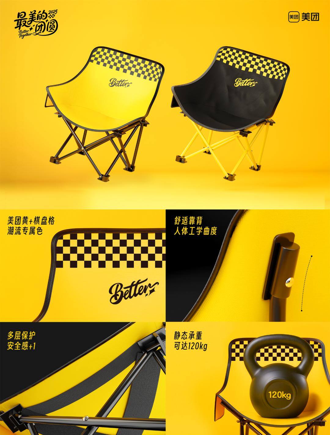 而占据礼盒主要容量的主角,其实是两把颜色鲜亮的月亮椅。它们覆盖着标志性的美团黄和棋盘图案,论实用性不失为一样秋日露营好物。