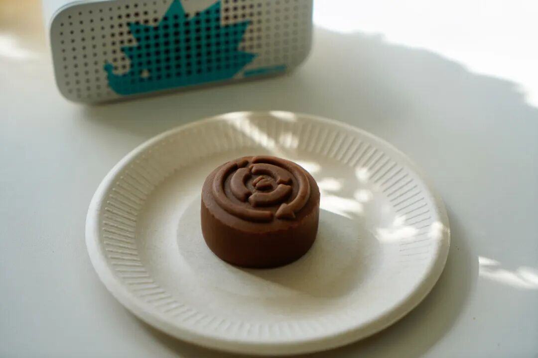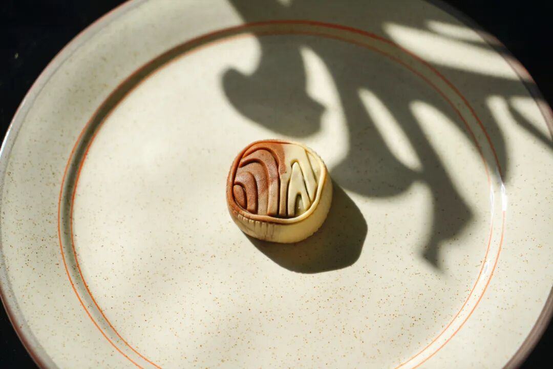 刚一端上来,深邃的棕褐色调就泄露了这块月饼的口味密码。一口咬下去,流心的巧克力馅几乎收获了全场好评,甚至得到了编辑部对月饼的最高评价:“不像月饼!”