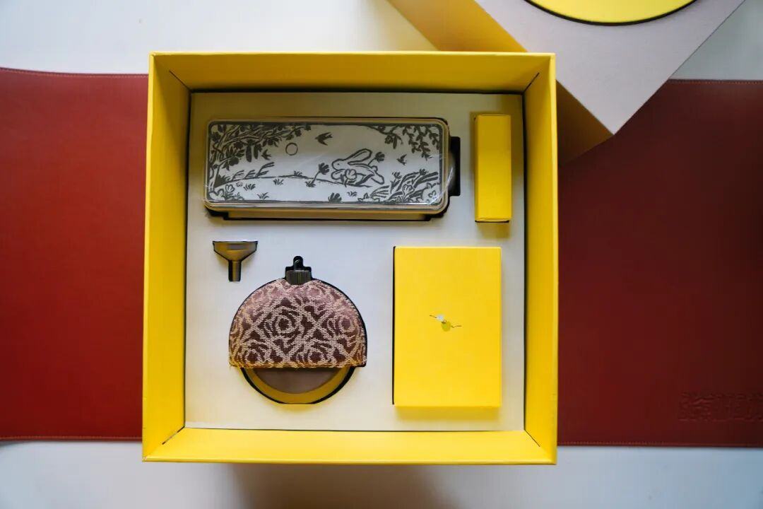 打开一看,里面不仅有仙人风姿的“月泉淮”摆件,还有琉璃小楼似的“映月楼”香薰灯,搭配“怀香”又“怀乡”的香牌,暗香浮动间寄寓了中国人独有的诗意情怀。