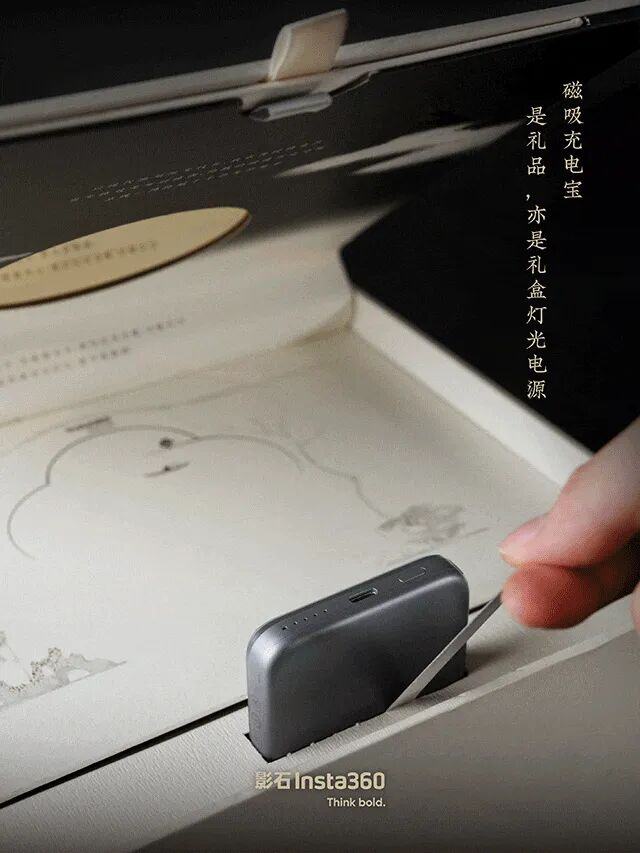 就礼盒本身而言,影石将苏州园林选作了最核心的文化元素,并将“移步换景”的园林理念融入了设计,杯垫杯盏身后是为“月亮”供电的磁吸充电宝,迷你月光以现代科技重新演绎出一幅游子归乡图。