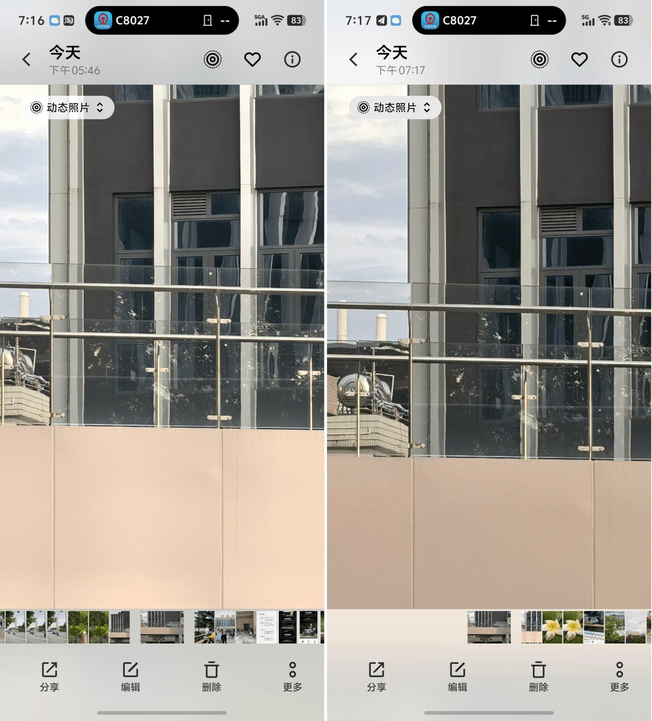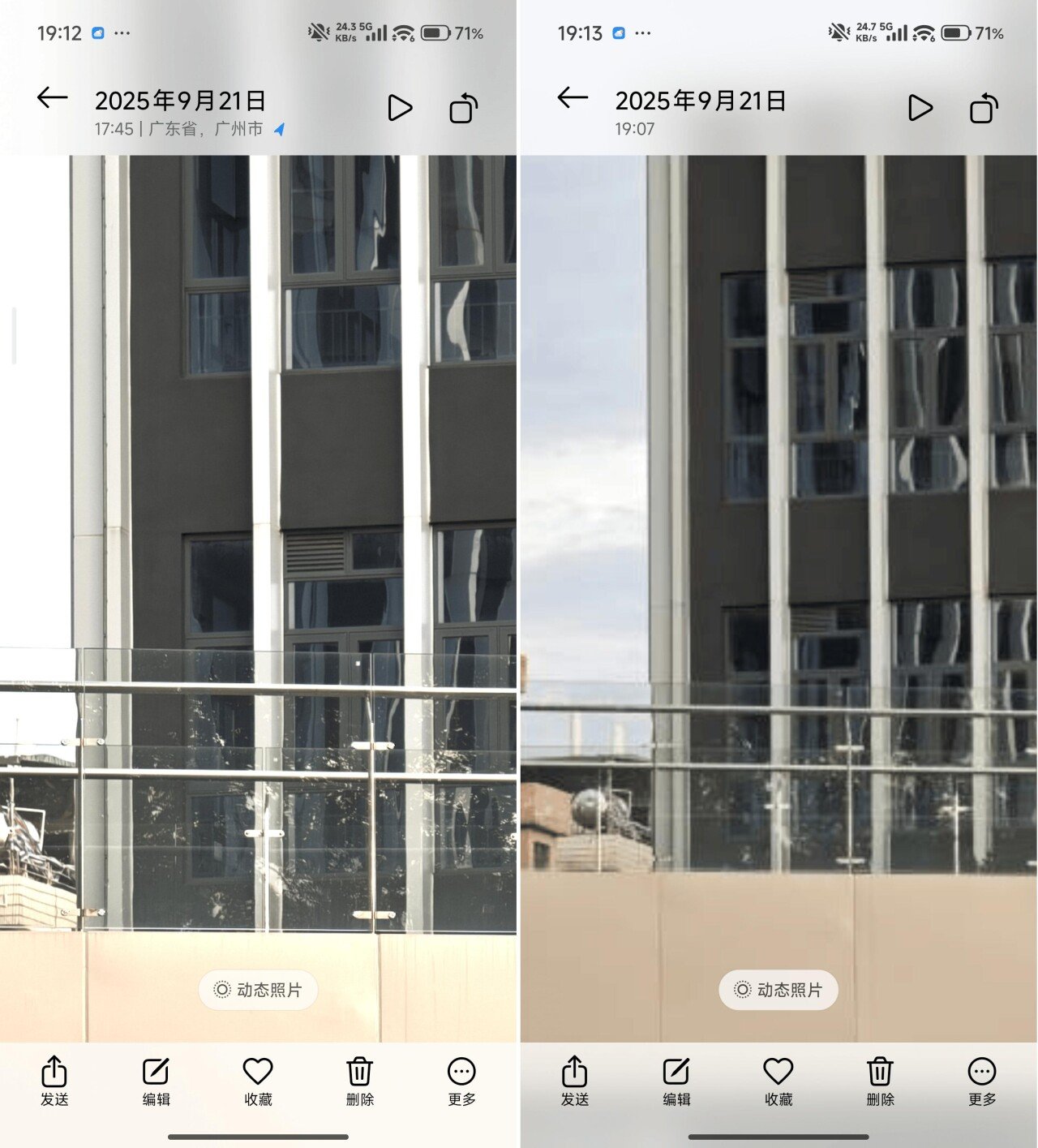 OPPO Find X8 Pro的问题最为突出。其拍摄的 Live Photo 分享到 iPhone 上时,有部分照片出现了「从 Live Photo 变成静态图」的情况,而且动态帧出现明显的色彩断层,原本的暖色调画面偏冷,且边缘出现不规则锯齿。